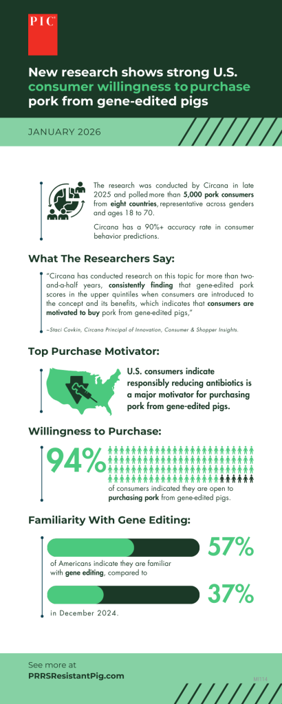 Hendersonville, TN, January 5, 2025—New research from Circana, commissioned by PIC, found that U.S. consumers clearly indicate that responsibly reducing the need for antibiotics is a major motivator to purchase pork from gene-edited pigs.